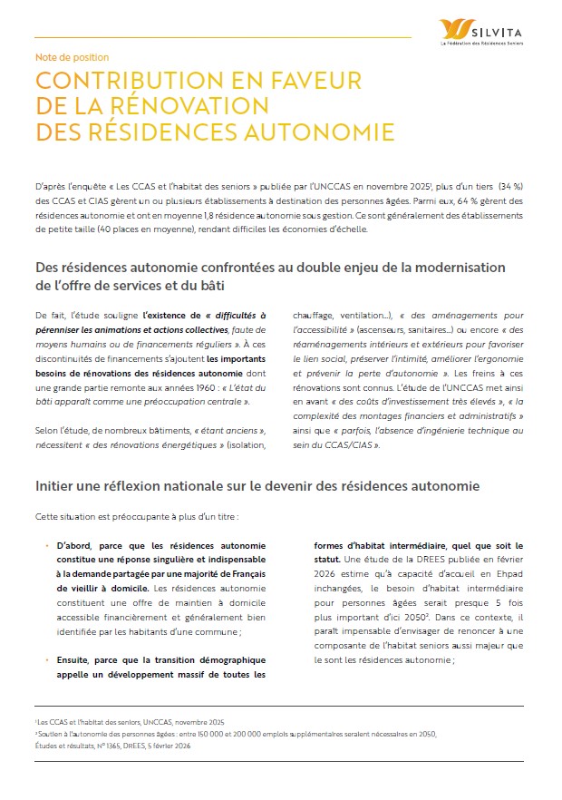 Alors que les élections municipales de 2026 permettent d’installer des équipes totalement ou partiellement renouvelées à la tête des exécutifs locaux, et qu’un nouvel acte de décentralisation se profile, Silvita se tient à la disposition des différentes parties prenantes pour contribuer activement à la réflexion sur la rénovation des résidences autonomie à l’horizon 2030.